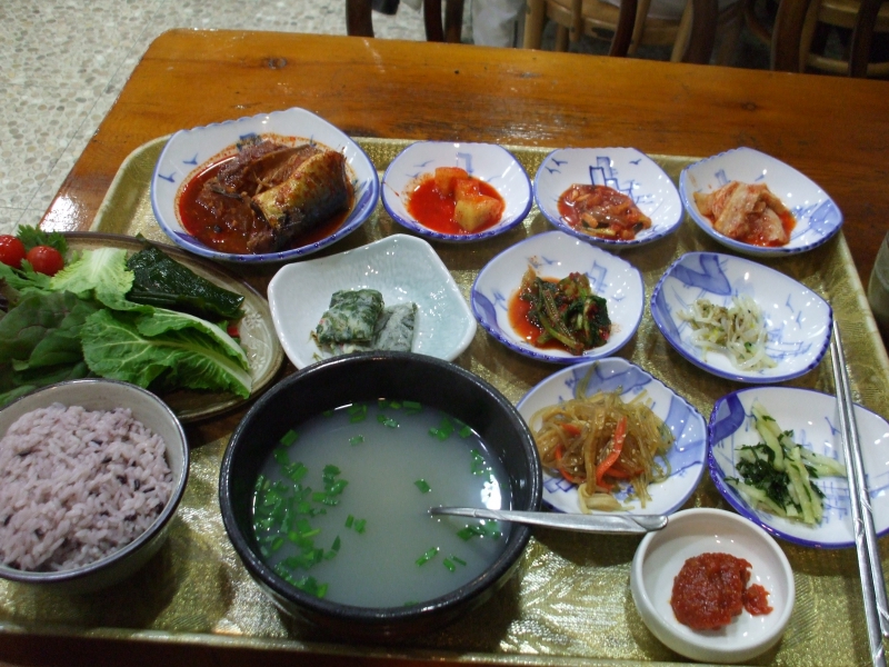 写真のようにスントゥブチゲとキムチ、おでんのおかずとわかめの冷スープとごはんだけのシンプルな定食です。
